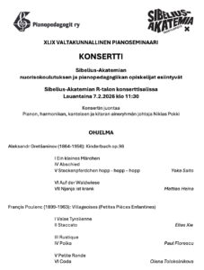 klo 11:30 Konsertti – Sibelius-Akatemian nuorisokoulutuksen ja pianopedagogiikan opiskelijat esiintyvät, konsertin juontaa ainejohtaja Niklas Pokki